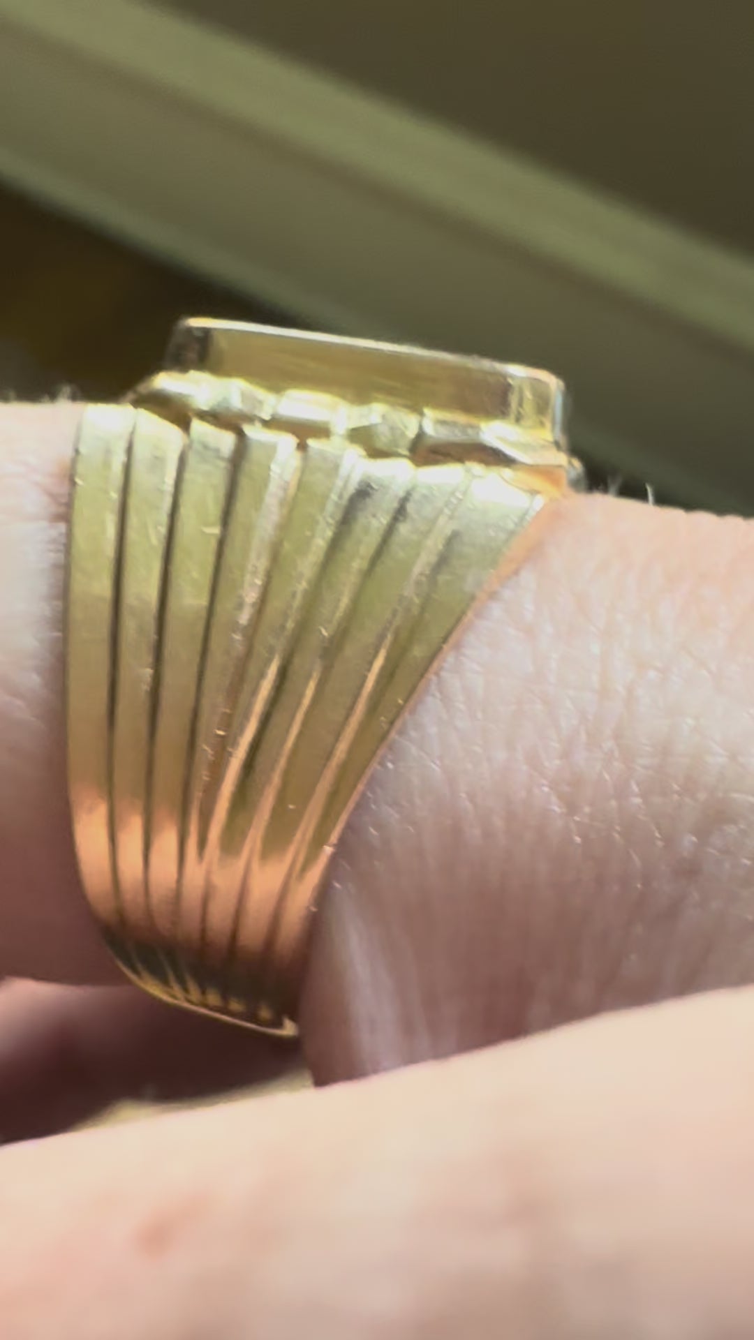 Fabulous chunky old signet ring with a bright pop of ruby. Easily engraved in the blank space which measures . Size (sizable). 10.1g of 18k yellow gold.