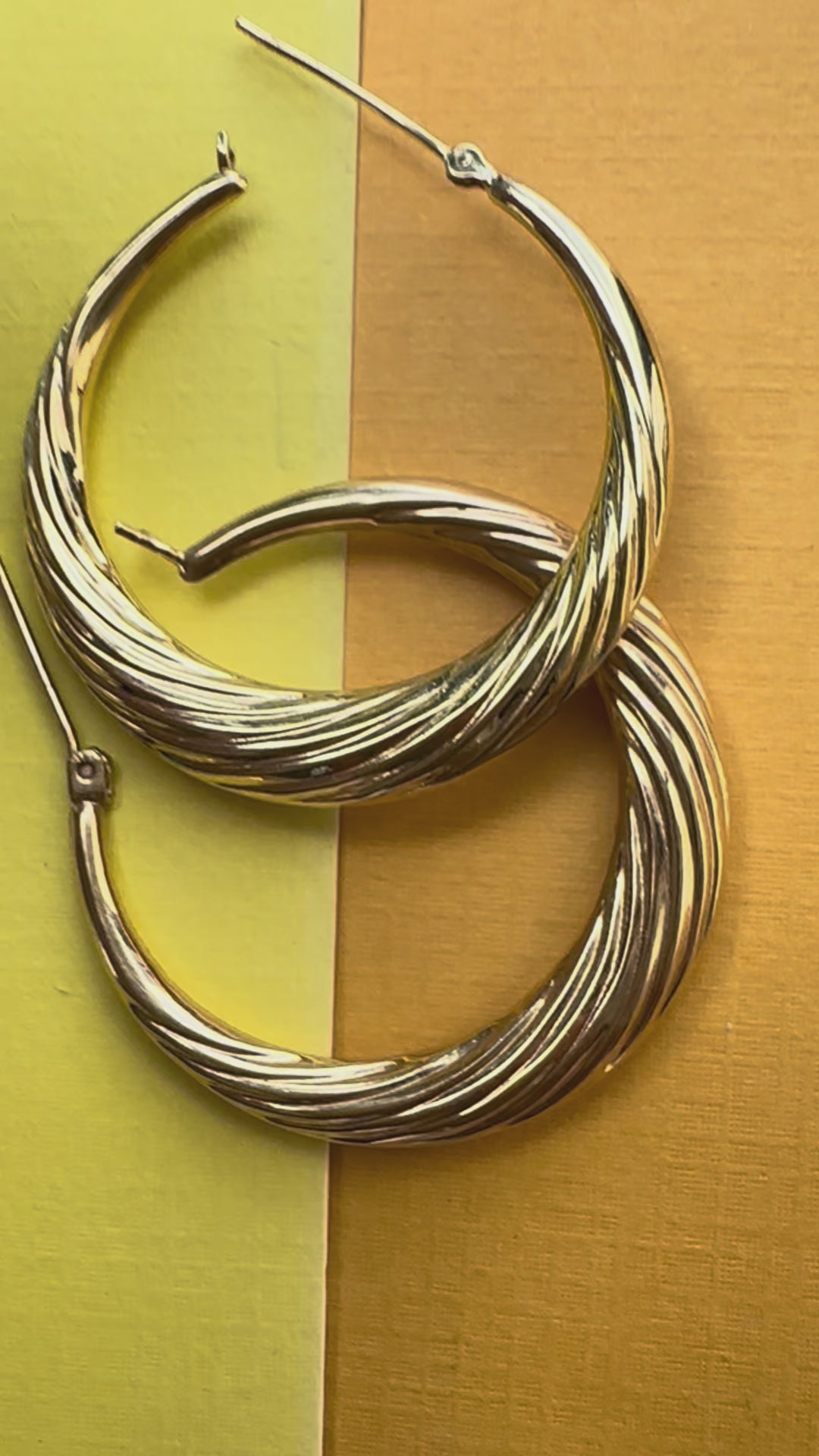 A classic 80s hoop style. Graduated croissant measuring 1 3/8" diameter. 14k yellow gold. In excellent vintage condition. 3.1g