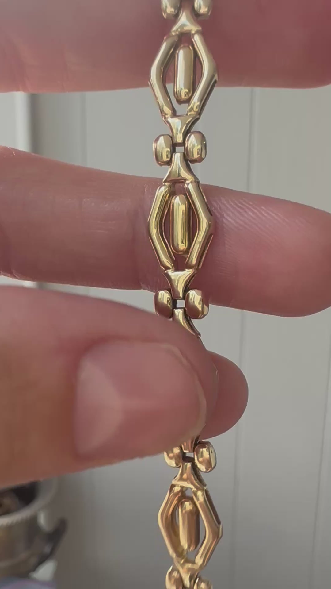Great style hexagon link with funky shape spacer link, 7" long (can shorten). 8.4mm wide. Box clasp and safety. 10.1g of 14k yellow gold.