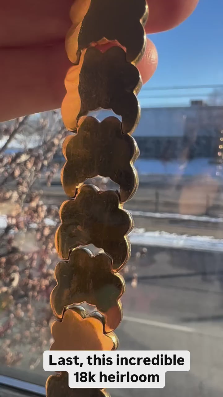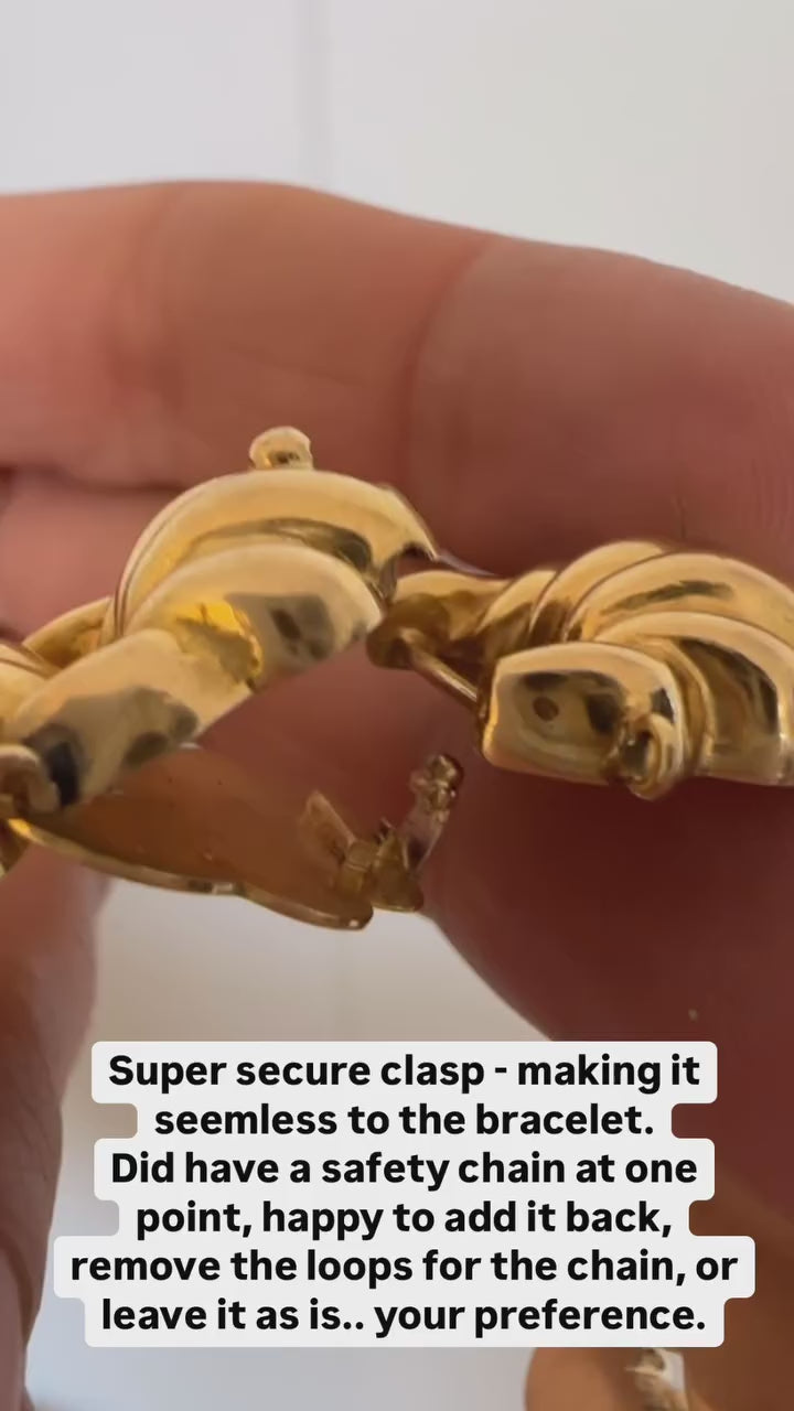 Spectacular heirloom 18k gold heavy croissant style bracelet. Super secure seemless clasp, blends into the bracelets. Crisp 18k hallmarks. 15.8mm wide, 47g, 6.75" long (can shorten for additional fee).